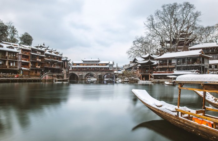 冬季住在凤凰古镇,最意外的惊喜是拉开阳台帷幔时,映入眼帘的是银色的世界,洁白的雪花铺满了整个大地,近处客栈和小店的黛瓦盖上一层皑皑白雪,妙不可言。